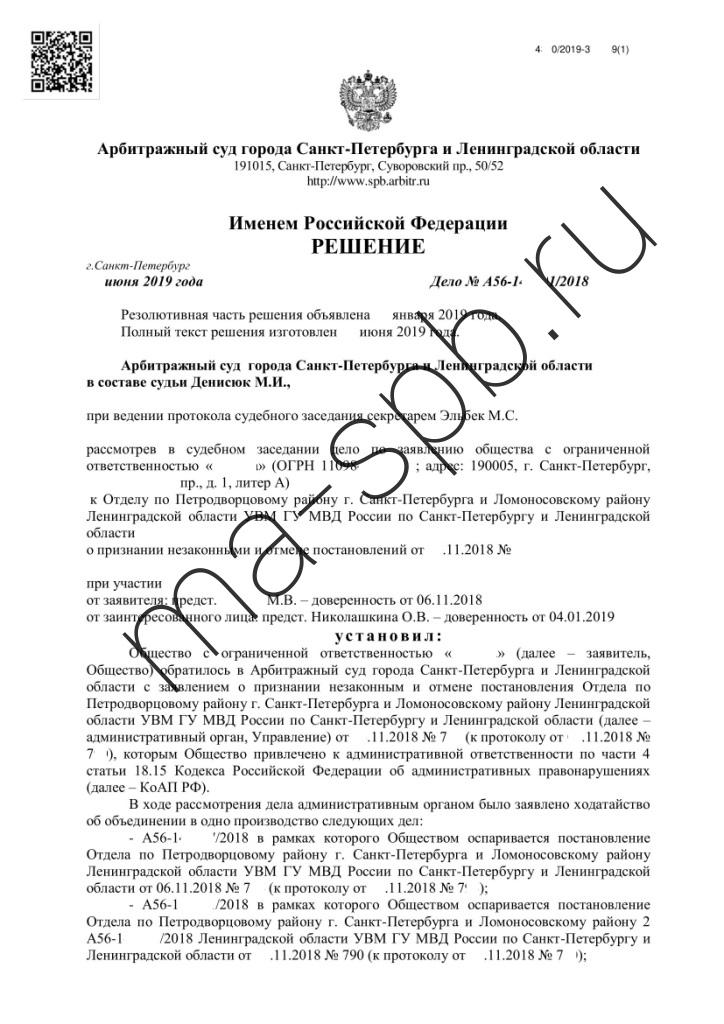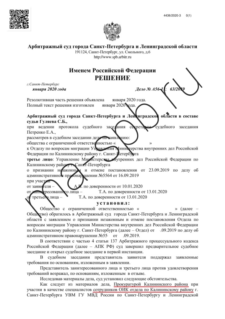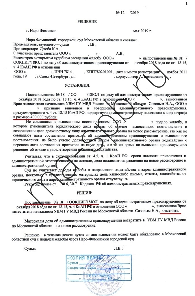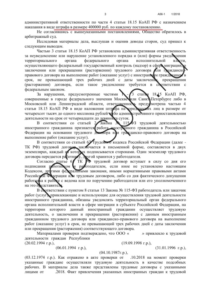 - Строительная компания, интересы которой представлял Миграционный Юрист, признана невиновной в совершении административных правонарушениях по ст.18.15 КоАП РФ. Ранее возбужденные дела отправлены на пересмотр