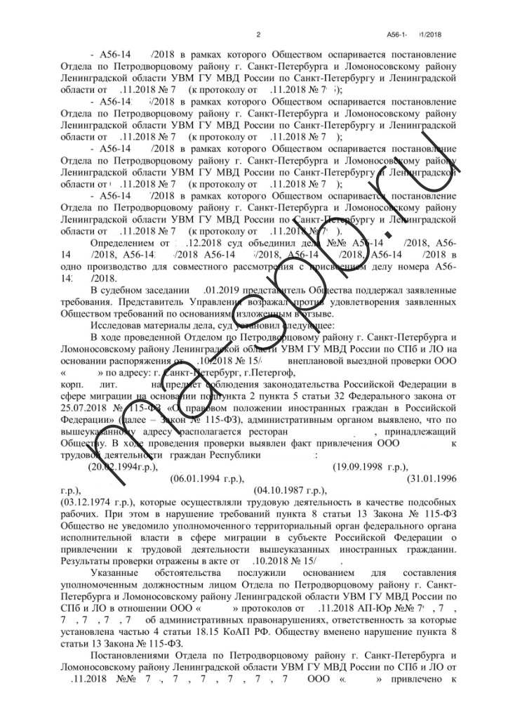 - январь 2019 - в ходе проведения документарной проверки ресторанной сети выявлены нарушения при подаче уведомлений и заключении и расторжении трудовых договоров с иностранными гражданами. Управляющей компании ресторанной сети грозило приостановление деятельности и огромный штраф.