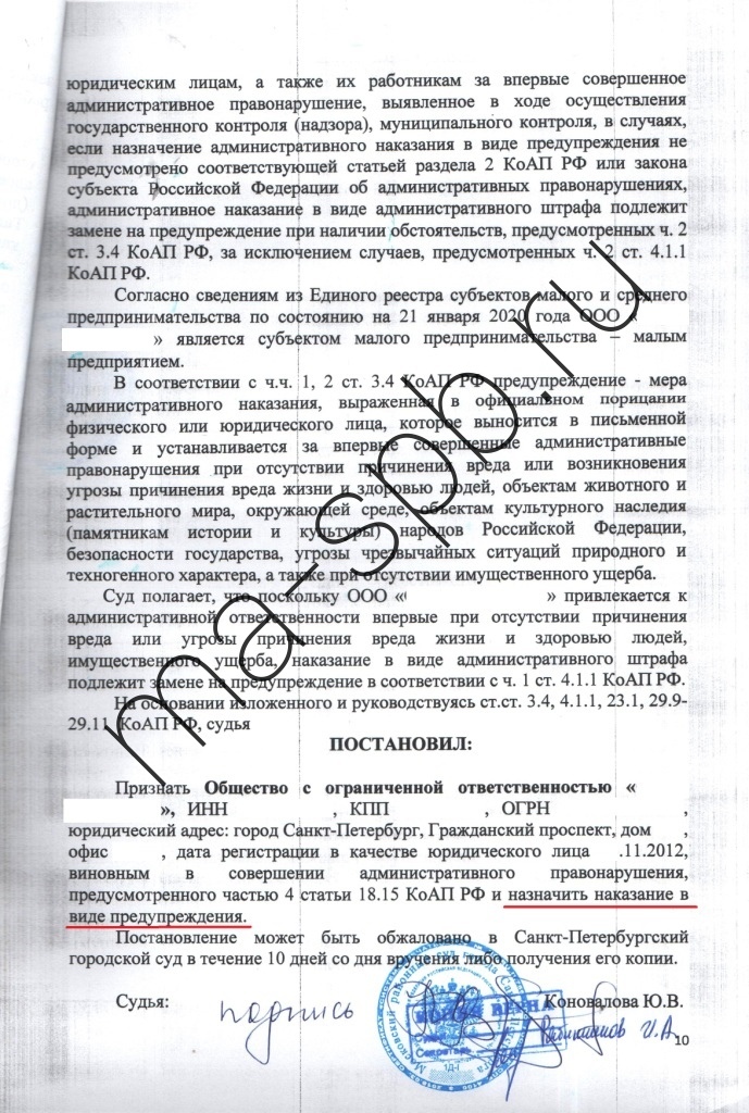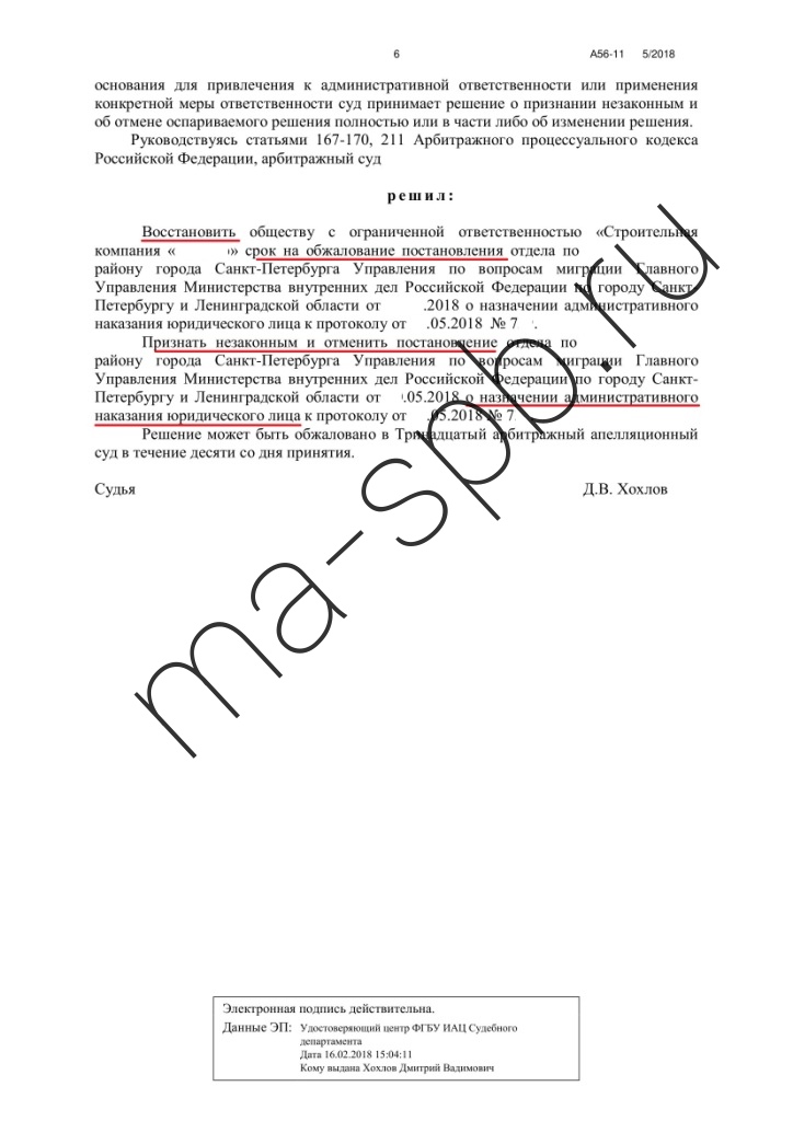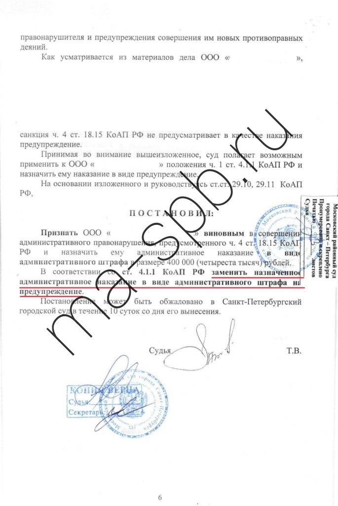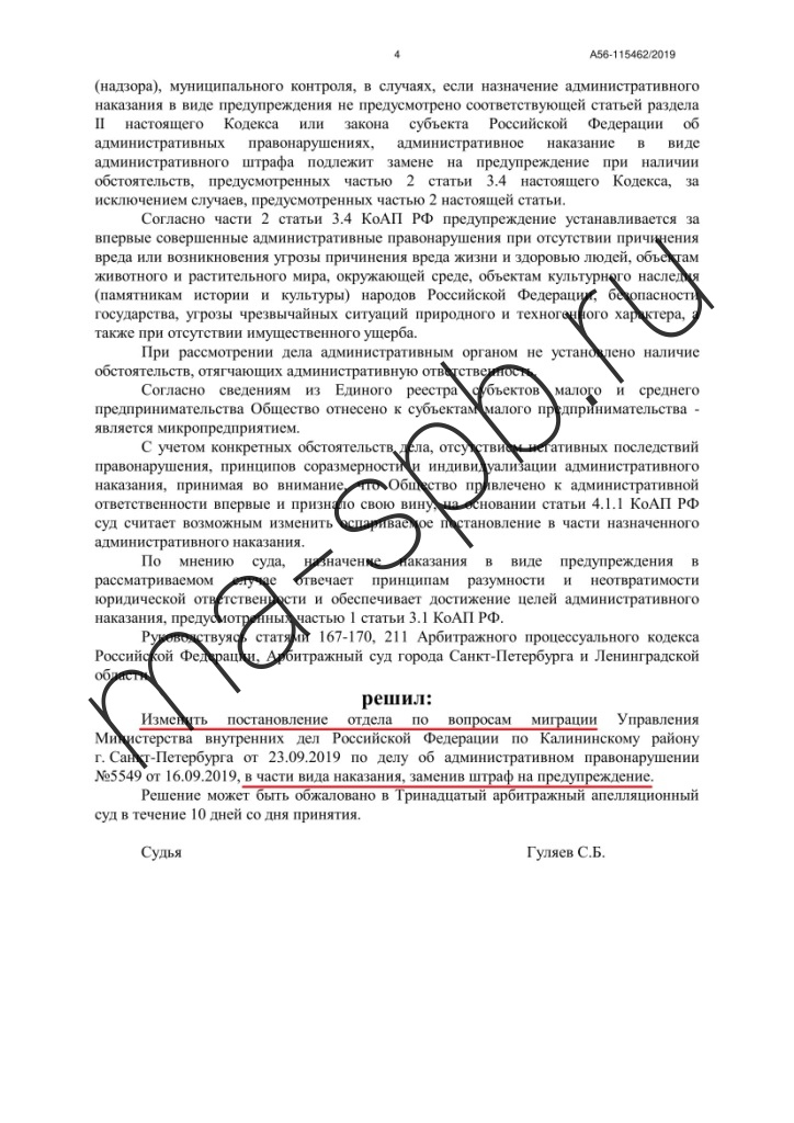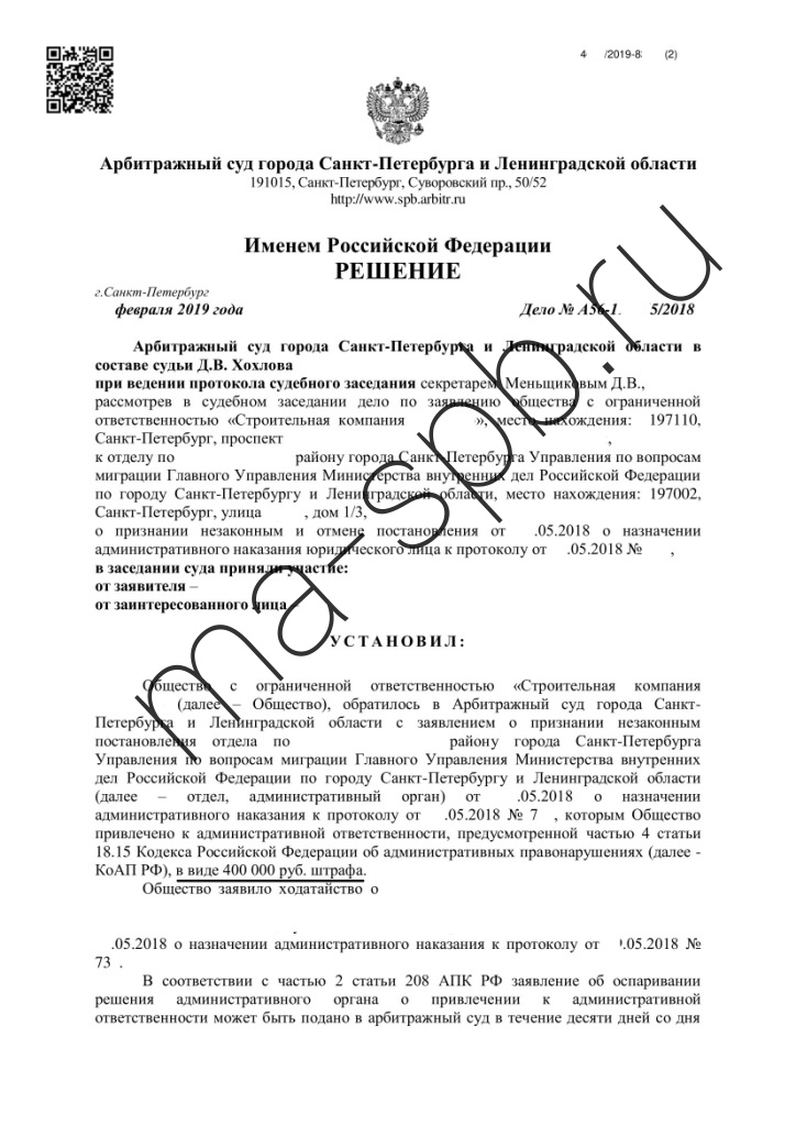 - Строительная компания, интересы которой представлял Миграционный Юрист, признана виновной по ст.18.15 КоАП РФ. Но в связи с малозначительностью по всем фактам нарушений назначено ПРЕДУПРЕЖДЕНИЕ