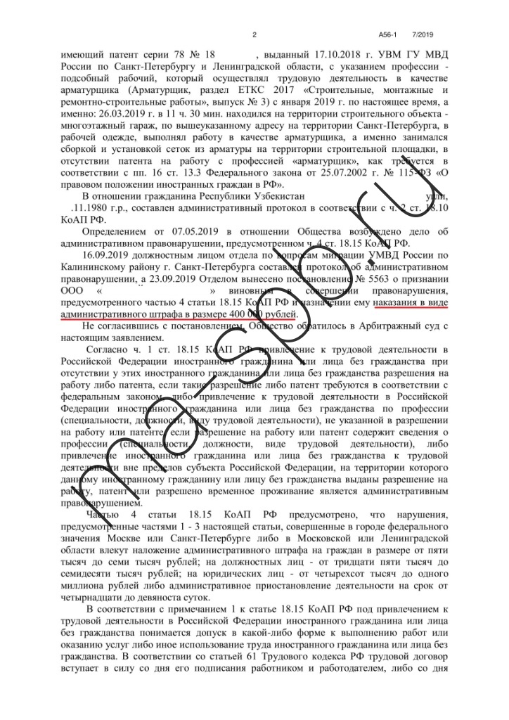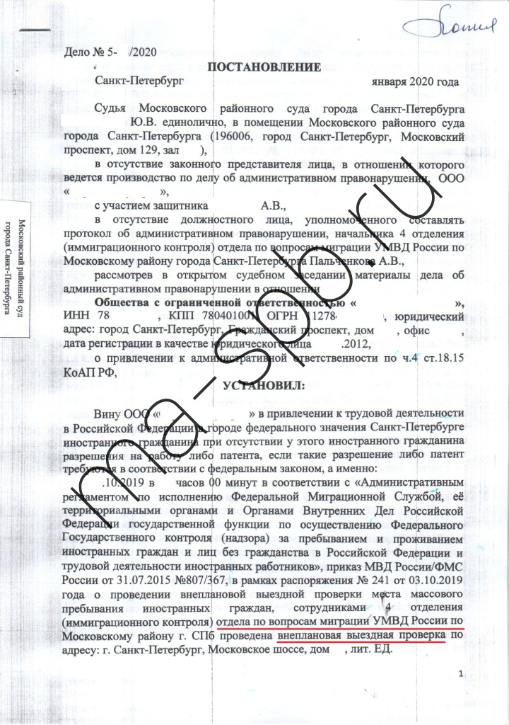 - январь 2020 - при проверке крупного строительного объекта Московское шоссе д. 13 сотрудниками УВМ Московского района выявлены нарушения привлечения иностранных работников. В отношении компании-доверителя возбудили несколько дел по ст. 18.15. Компании грозил крупный штраф в несколько миллионов.