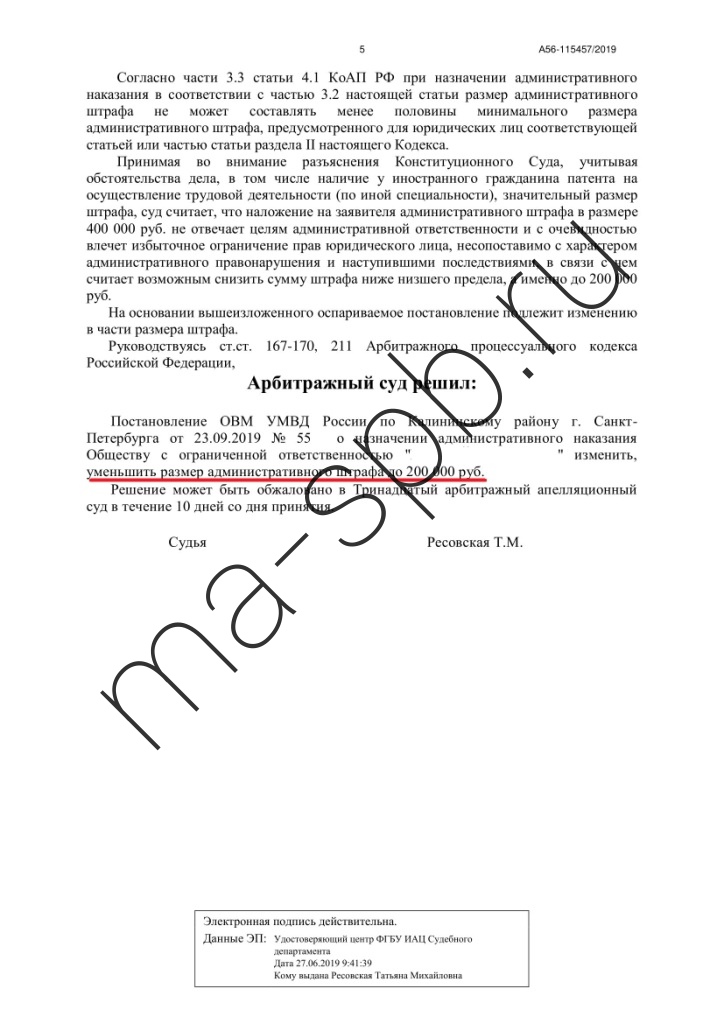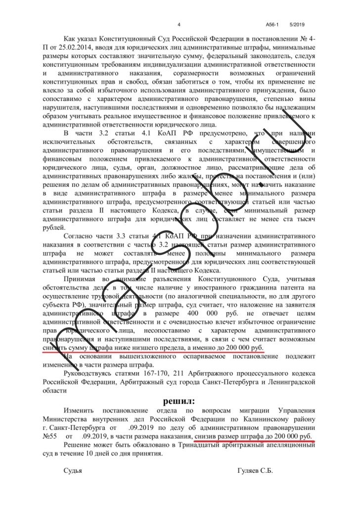 - Крупная строительная компания, интересы которой представлял Миграционный Юрист, добилась пересмотра всех постановлений с уменьшением суммы штрафа в 2 раза.