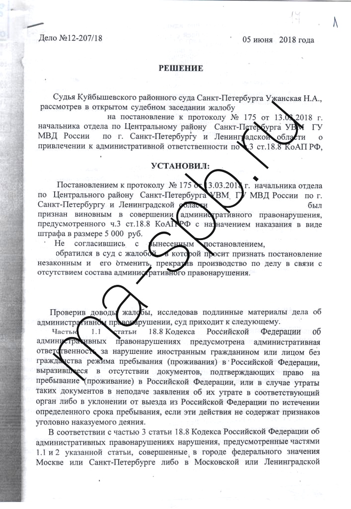 - август 2017 г. - иностранному гражданину назначено наказание в виде выдворения. Санкт-Петербургским городским судом по жалобе защитника принято решение о пересмотре.