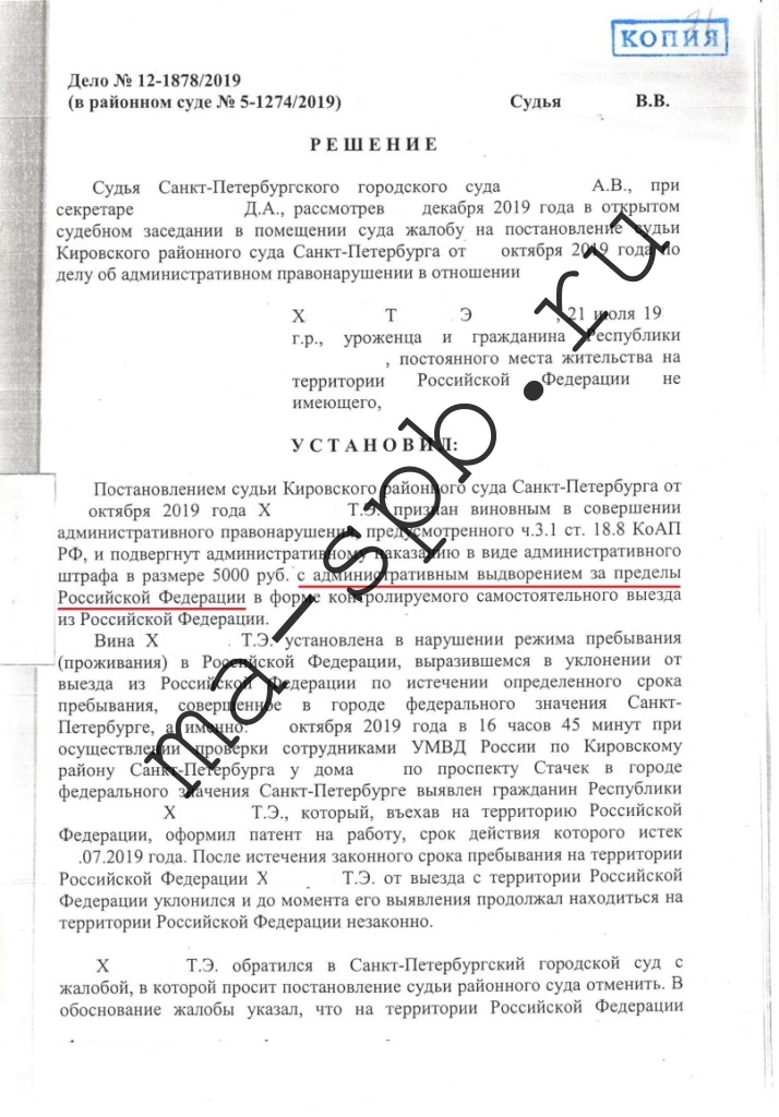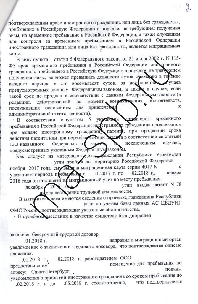 - декабрь 2019 - гражданин Республики Узбекистан признан виновным в нарушении сроков пребывания в России из-за нарушения сроков оплаты патента на работу. Первая инстанция назначила наказание в виде штрафа и выдворения из России.
