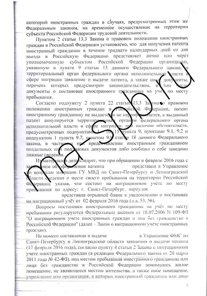 - май 2016 г. - из-за нарушения порядка оплаты патента на работу, иностранному гражданину УФМС по СПб запретили въезд, посчитав его пребывание в России незаконным.