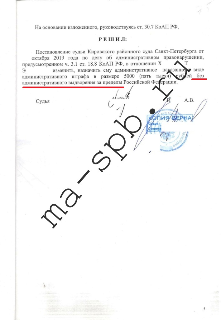 - Постановление Калининского районного суда изменить в части - оставить штраф, но отменить выдворение