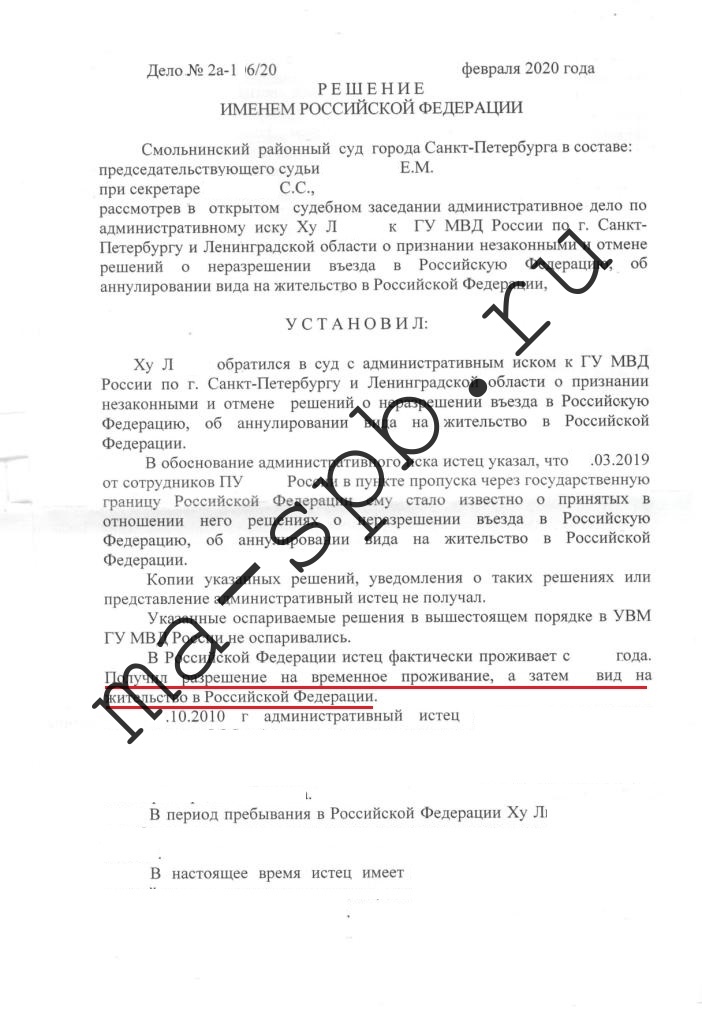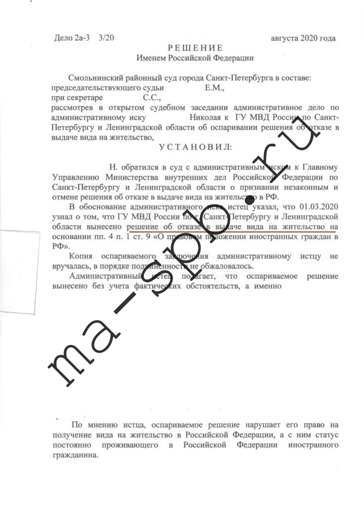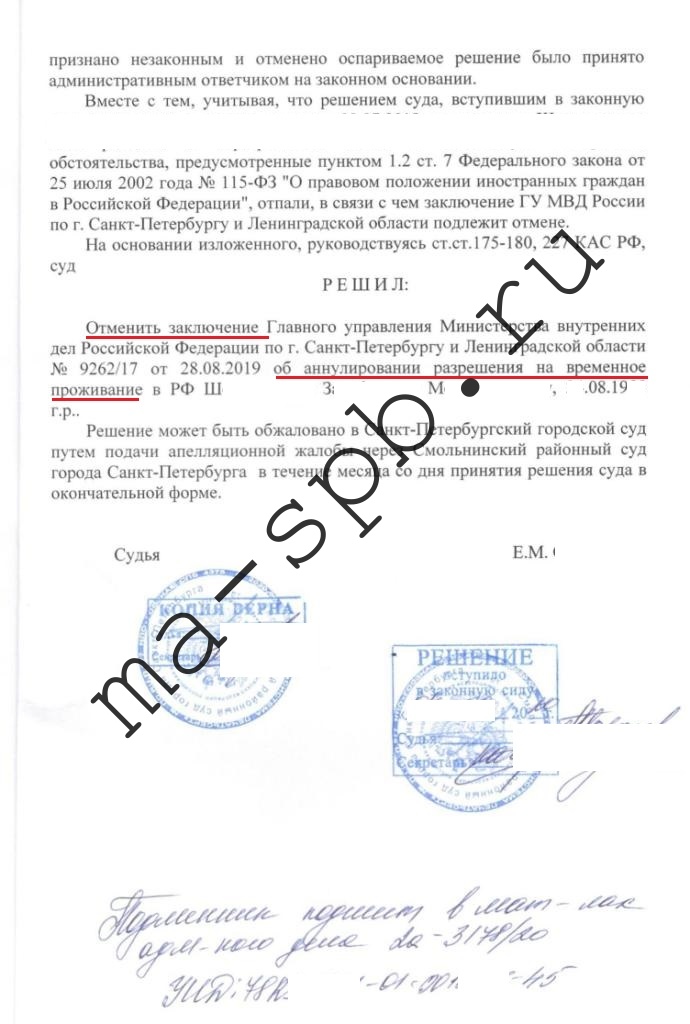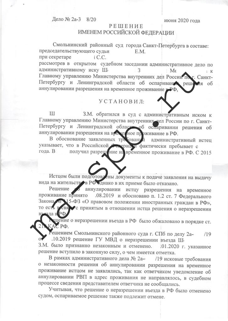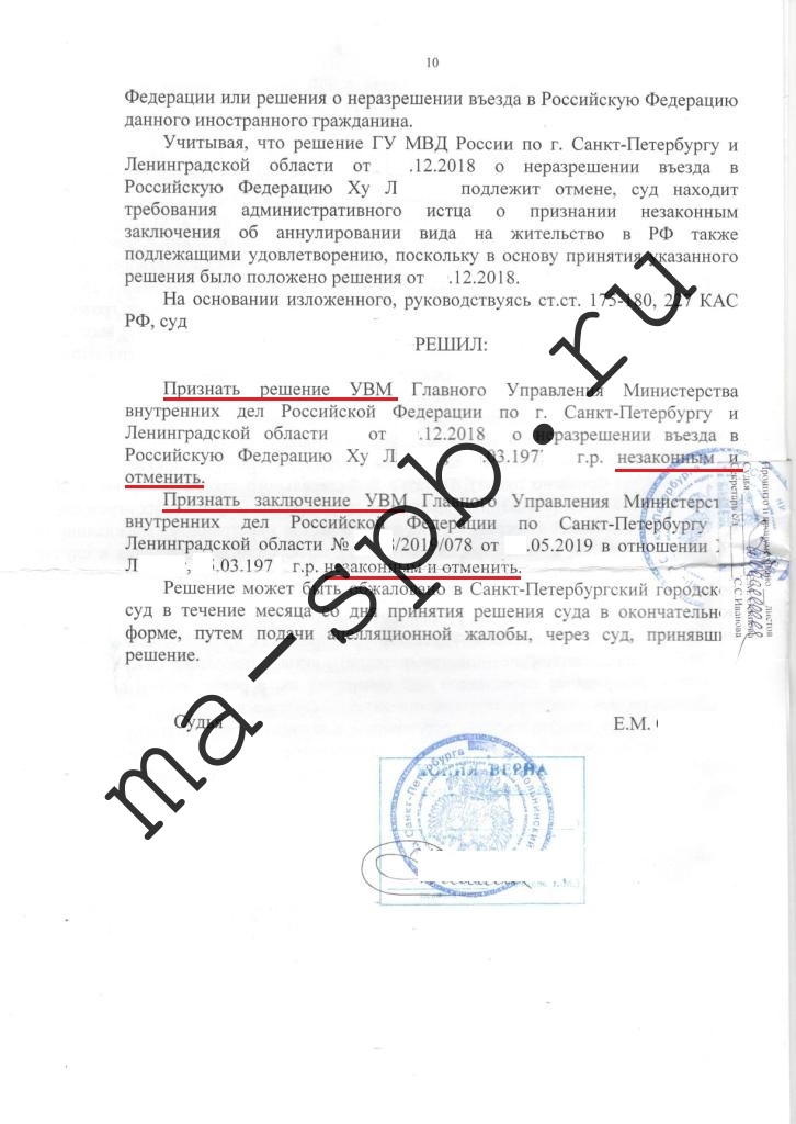 - Решения УВМ ГУ МВД о запрете на въезд и аннулировании ВНЖ отменены судом. Решение оставлено в силе апелляционный и кассационной инстанцией.