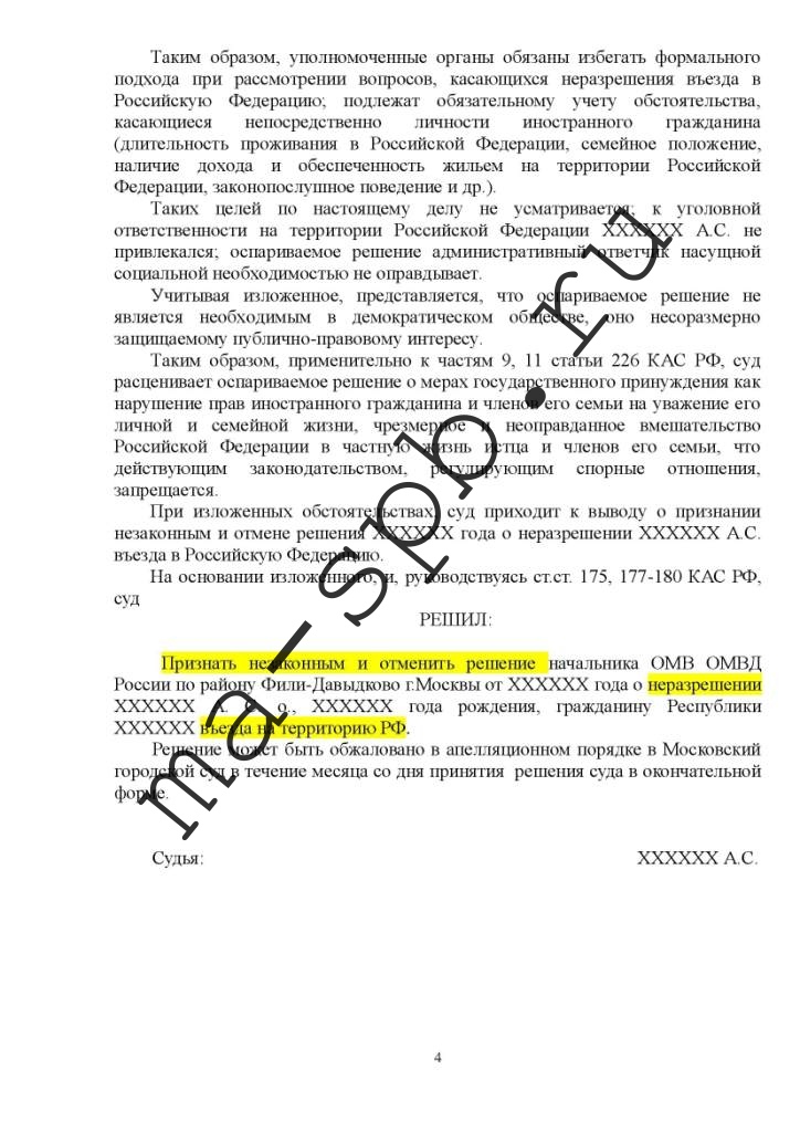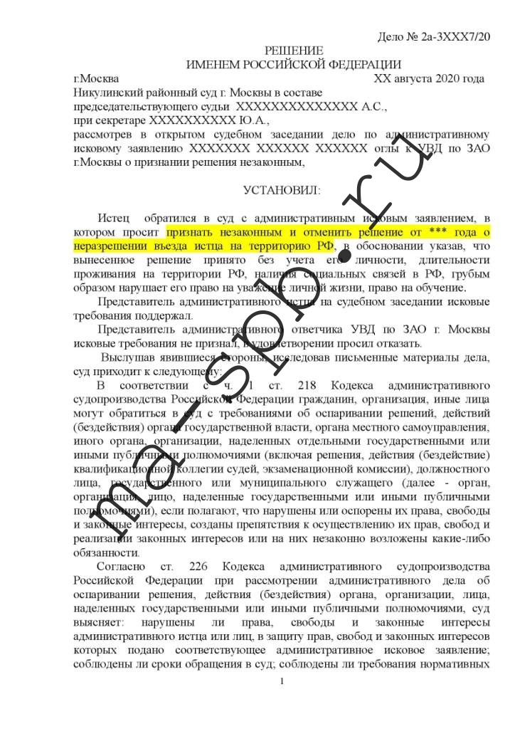 - Решения УВМ ГУ МВД по г. Москва о запрете на въезд признаны судом незаконными и отменены.