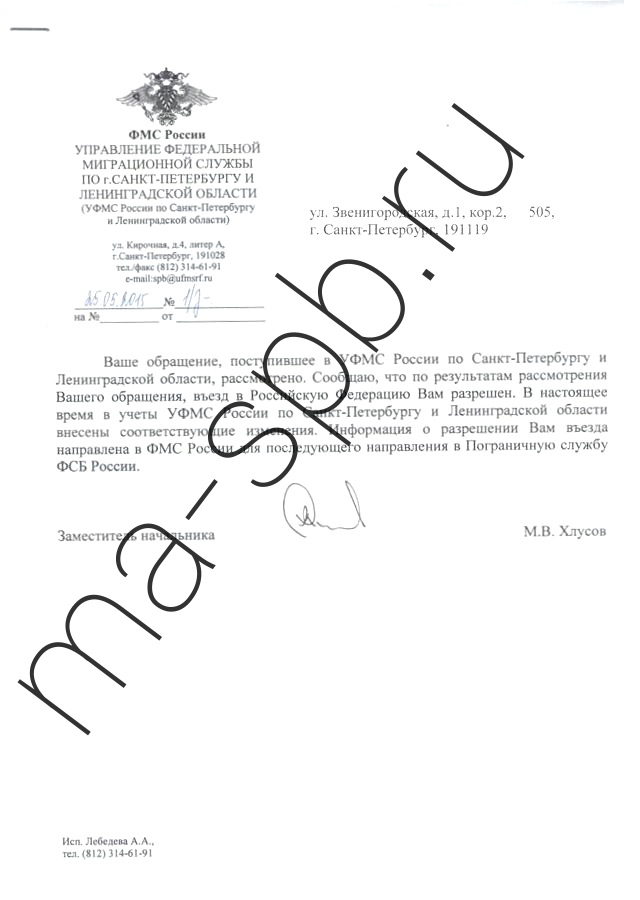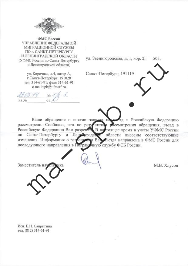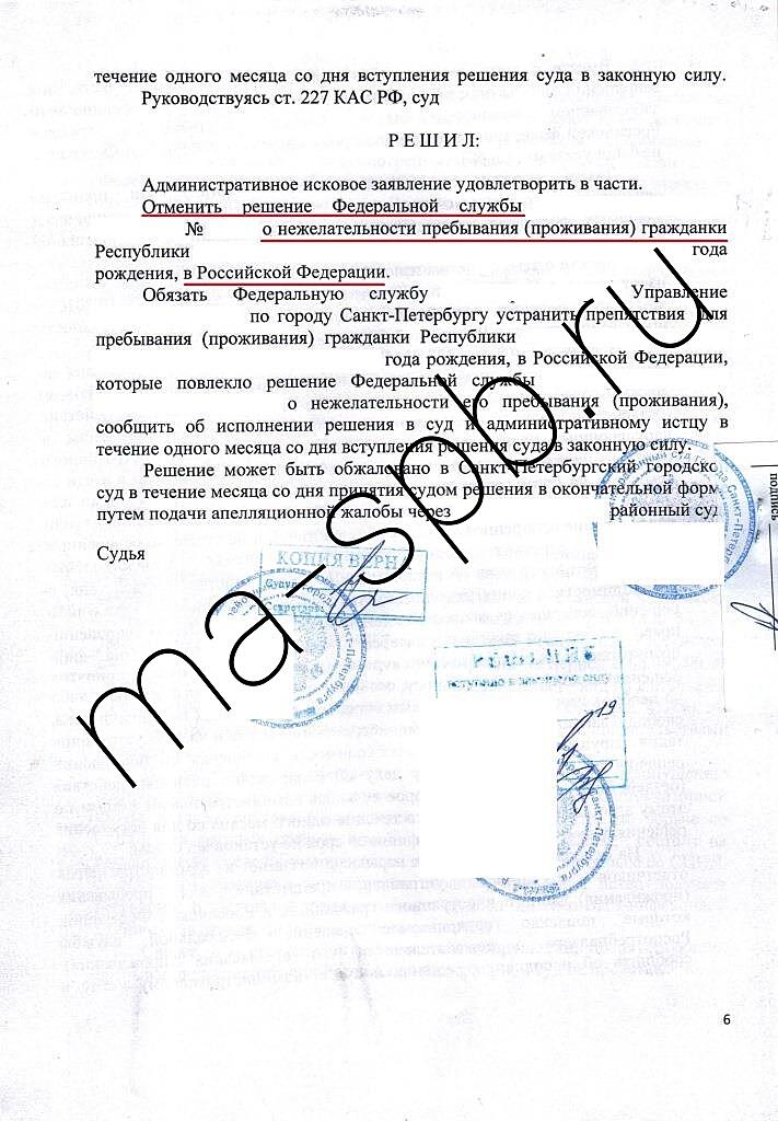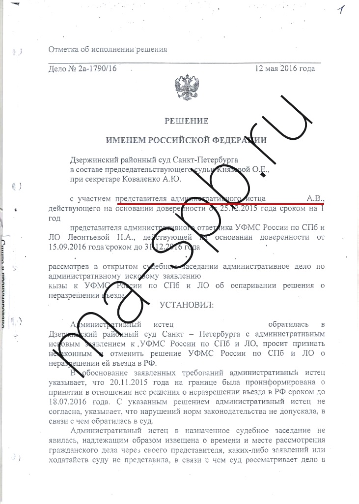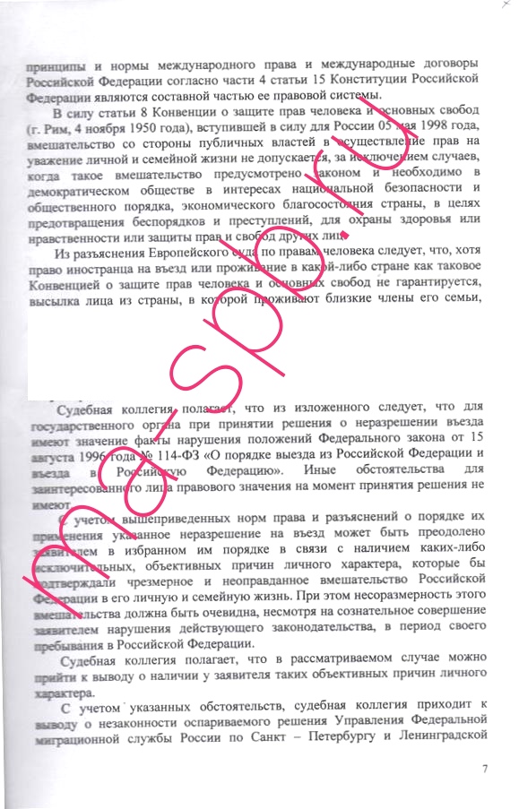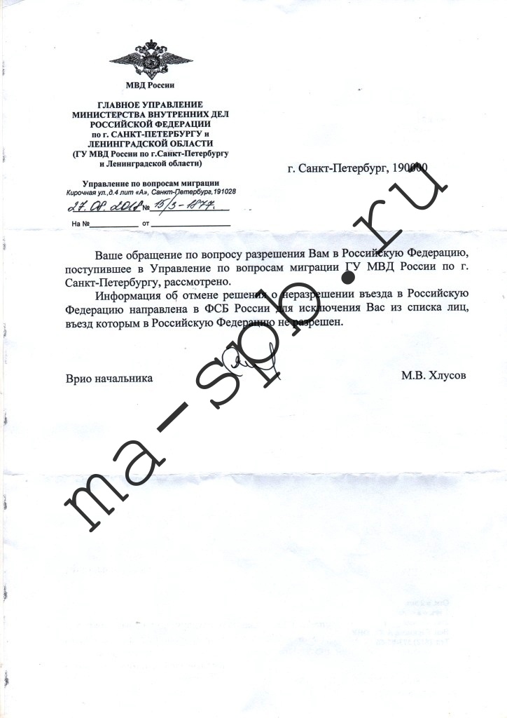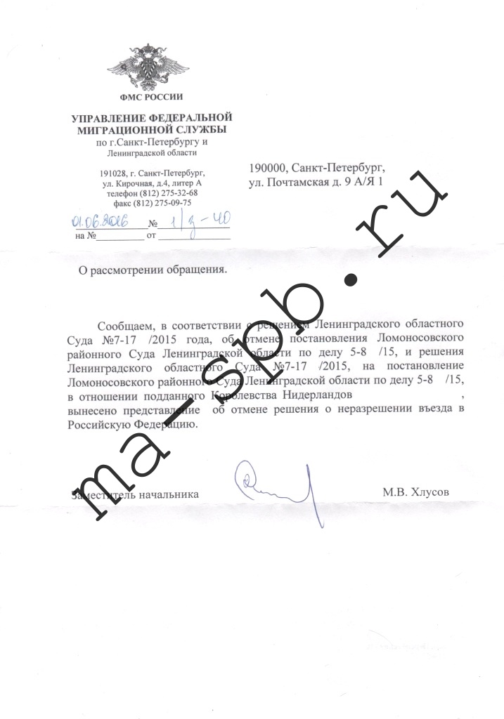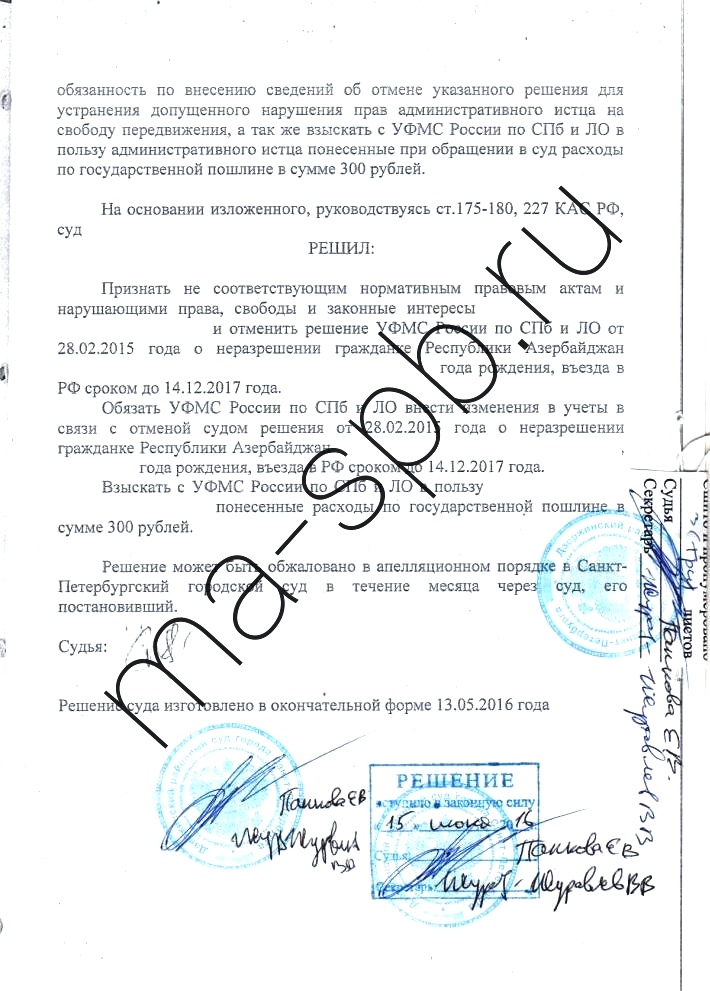 - Решение УФМС по г.Санкт-Петербургу отменить. Въезд разрешить.