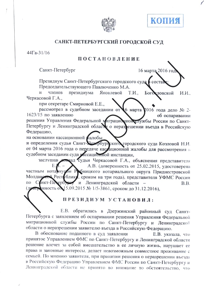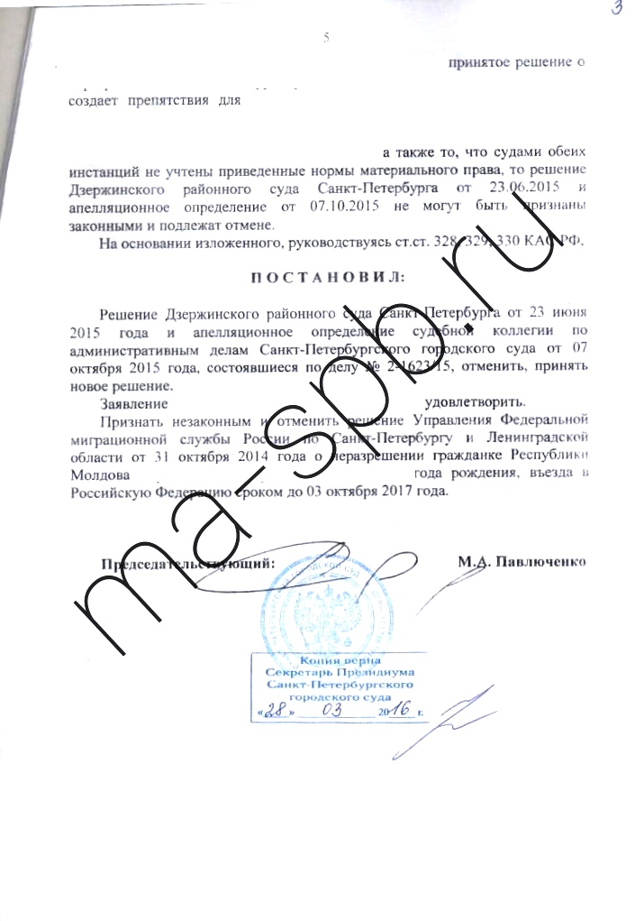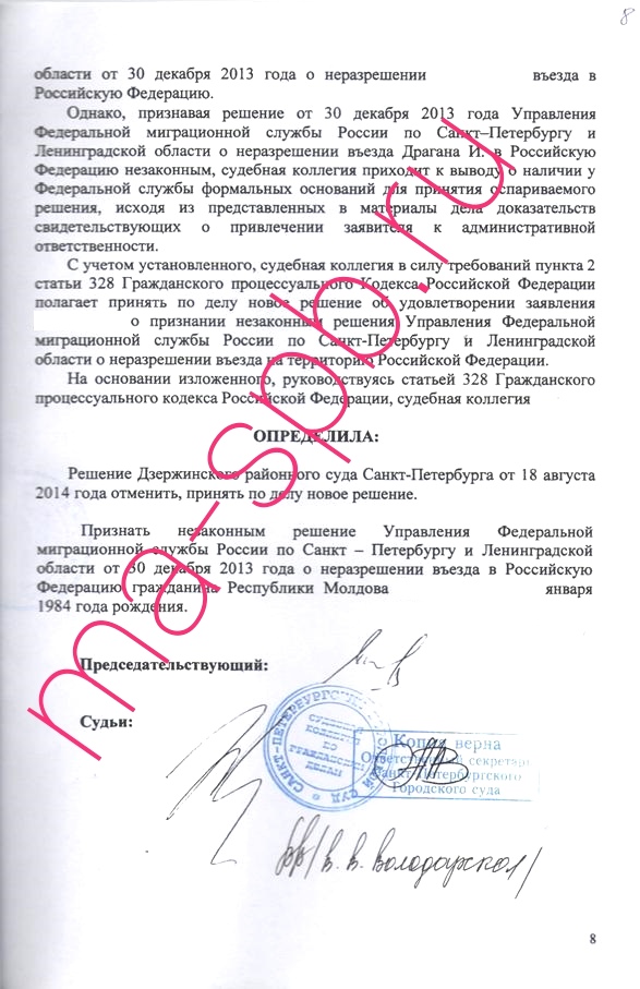 - Отменить решение УФМС по г.Санкт-Петербургу о неразрешении въезда и решение суда первой инстанции. Въезд гражданину Молдовы И. разрешить.