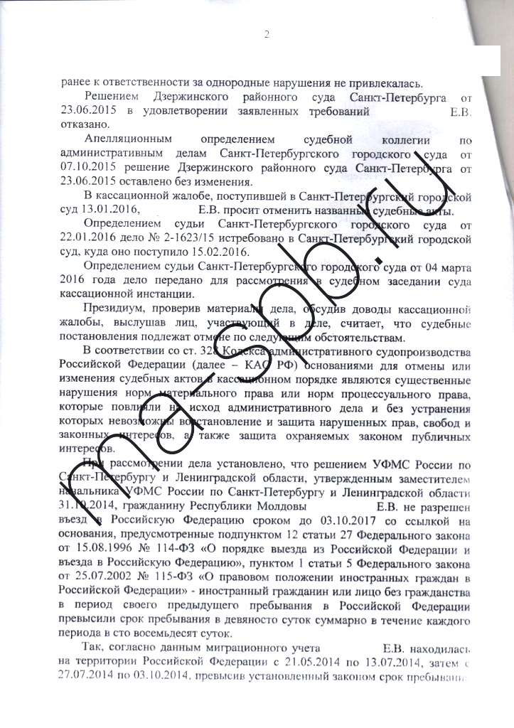 - июнь 2016 г. - решением Ленинградского областного суда было отменено выдворение из России высококвалифицированного специалиста, гражданина Королевства Нидерланды. Решение апелляционной инстанции вступило в законную силу в тот же день, но сотрудники УФМС исполнять его не торопились.