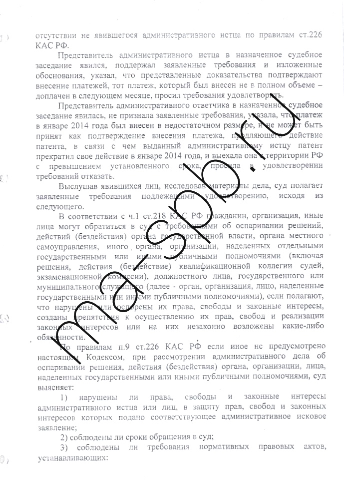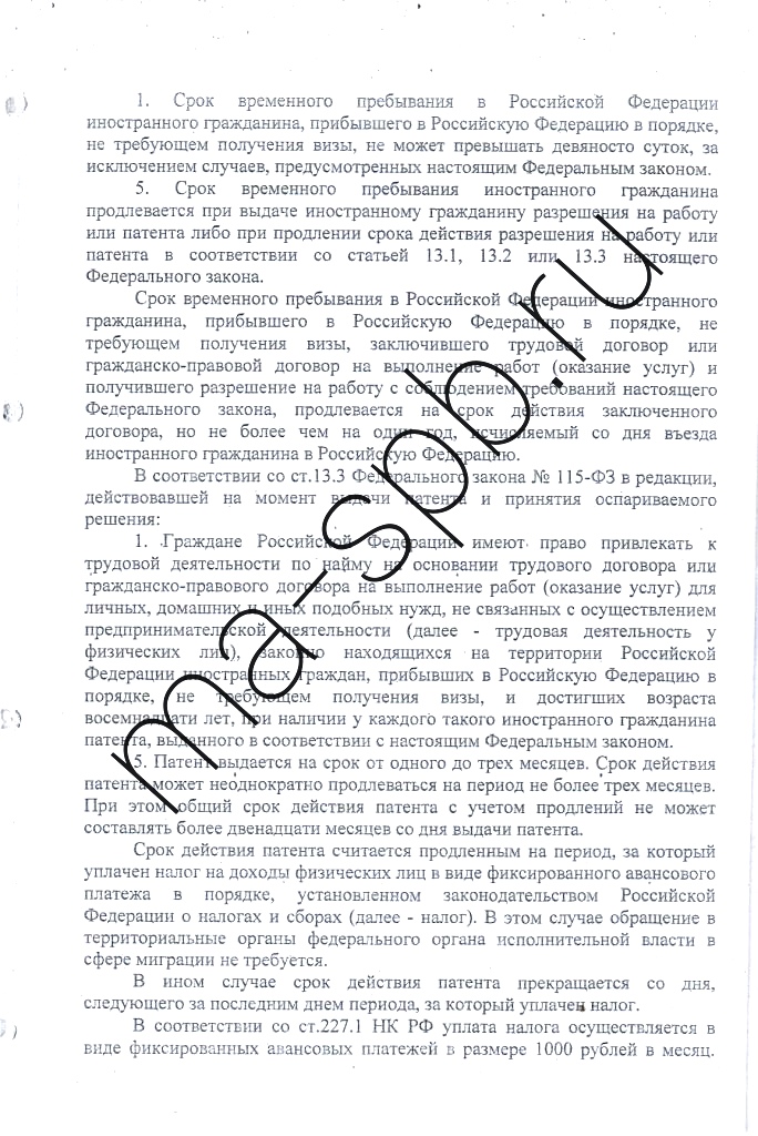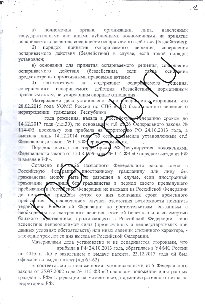 - май 2016 г. - из-за нарушения порядка оплаты патента на работу, иностранному гражданину УФМС по СПб запретили въезд, посчитав его пребывание в России незаконным.